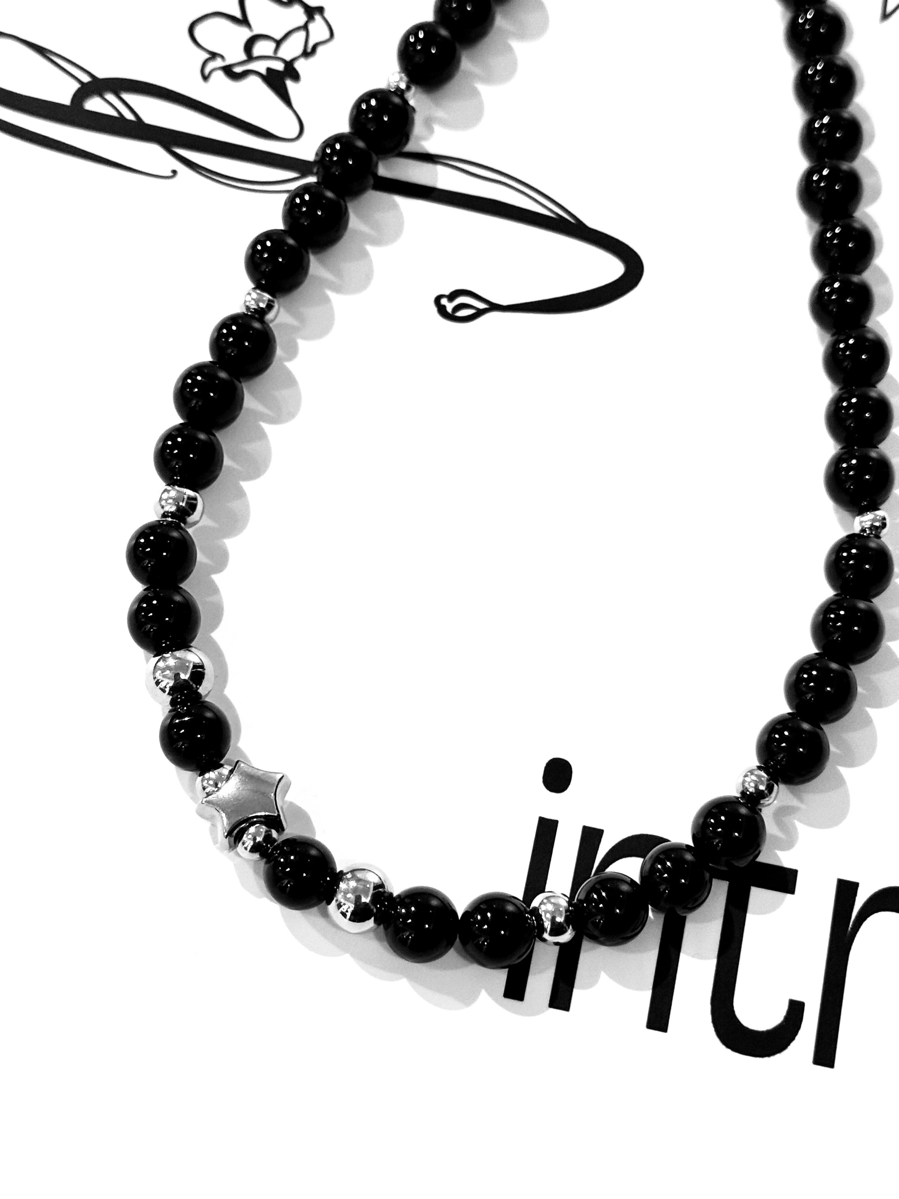 夜空を表現した黒いオニキス・流れ星のようなシルバーのパーツを使い、老若男女問わず付けやすいデザインにしました。