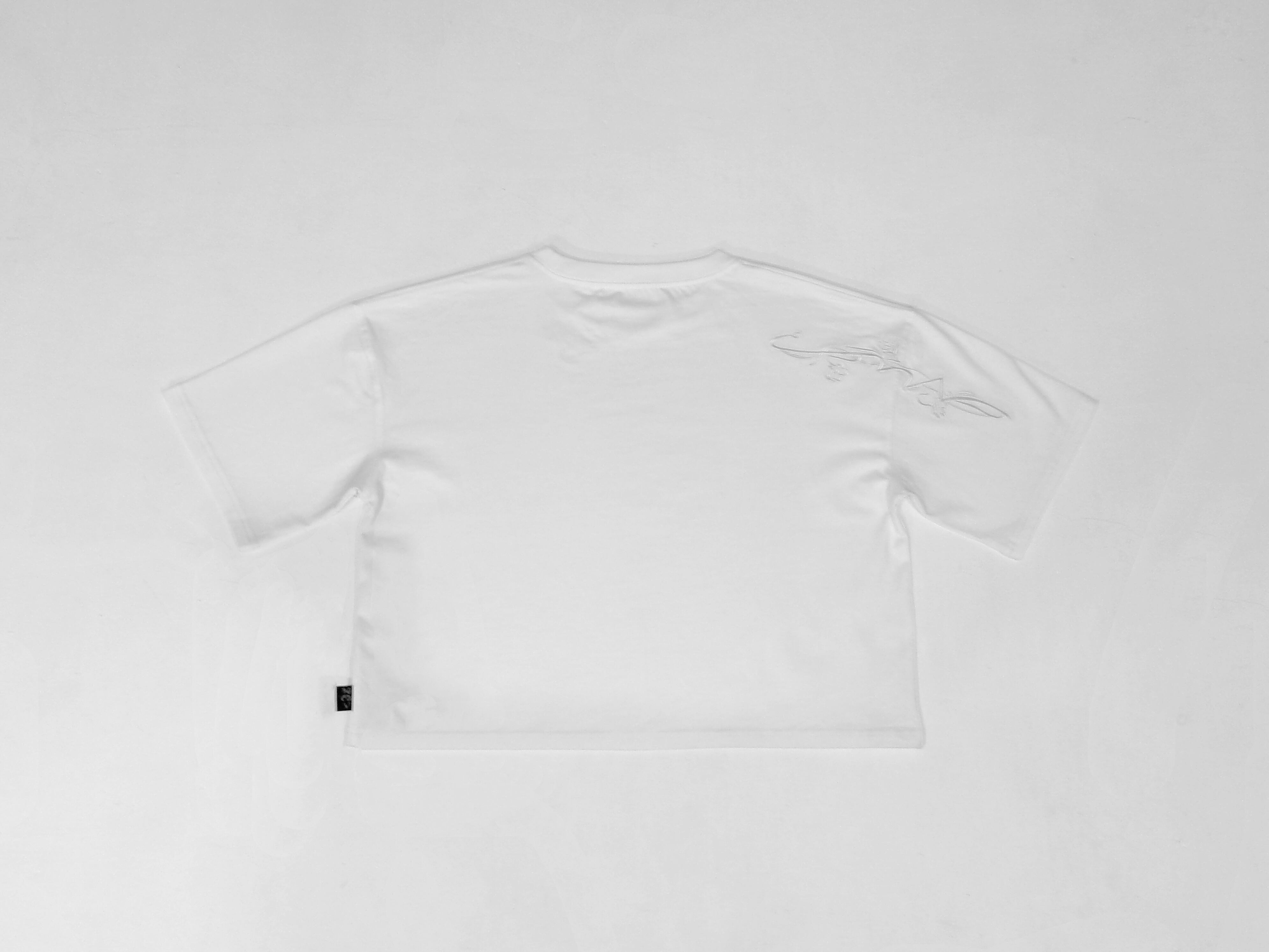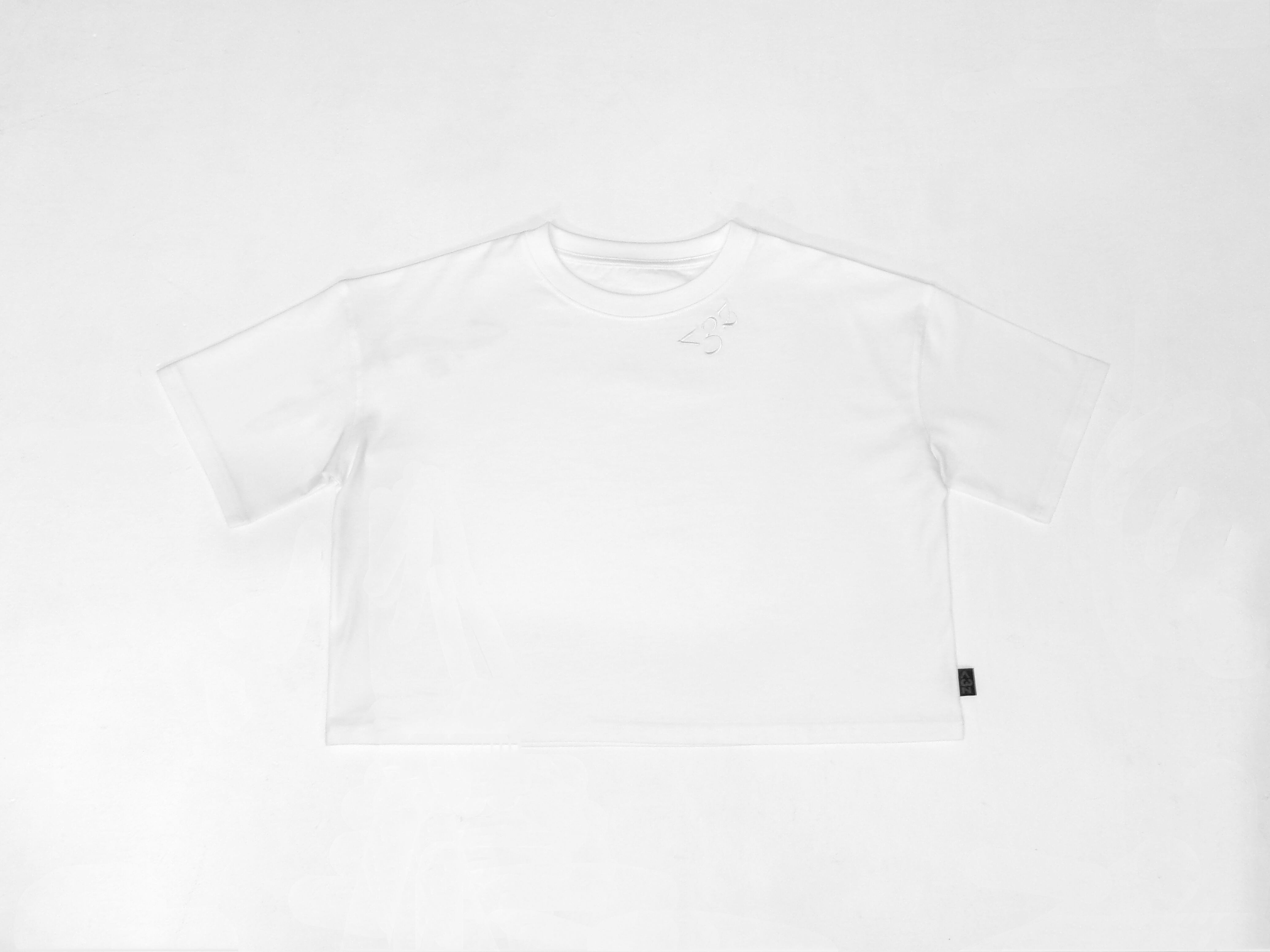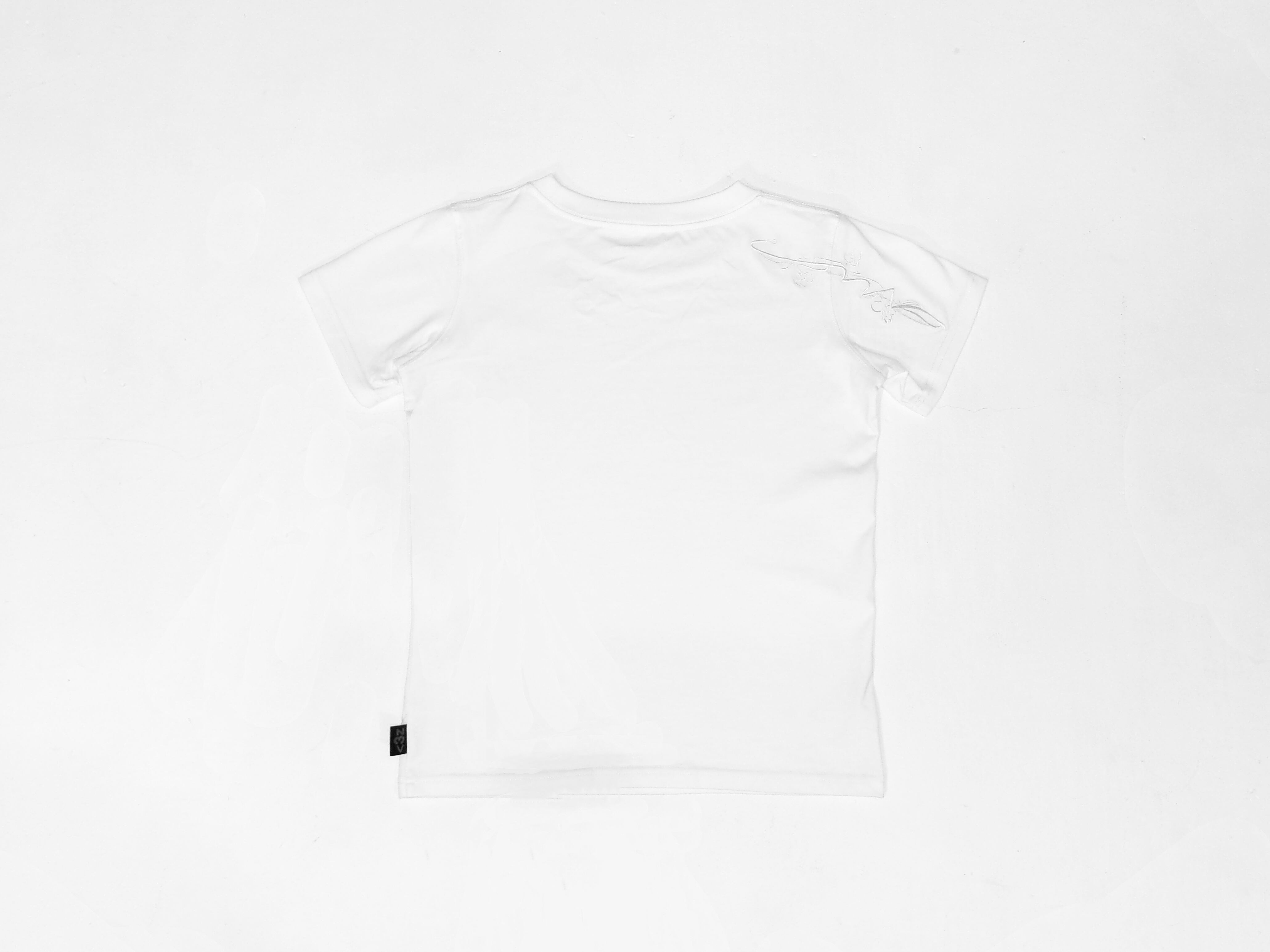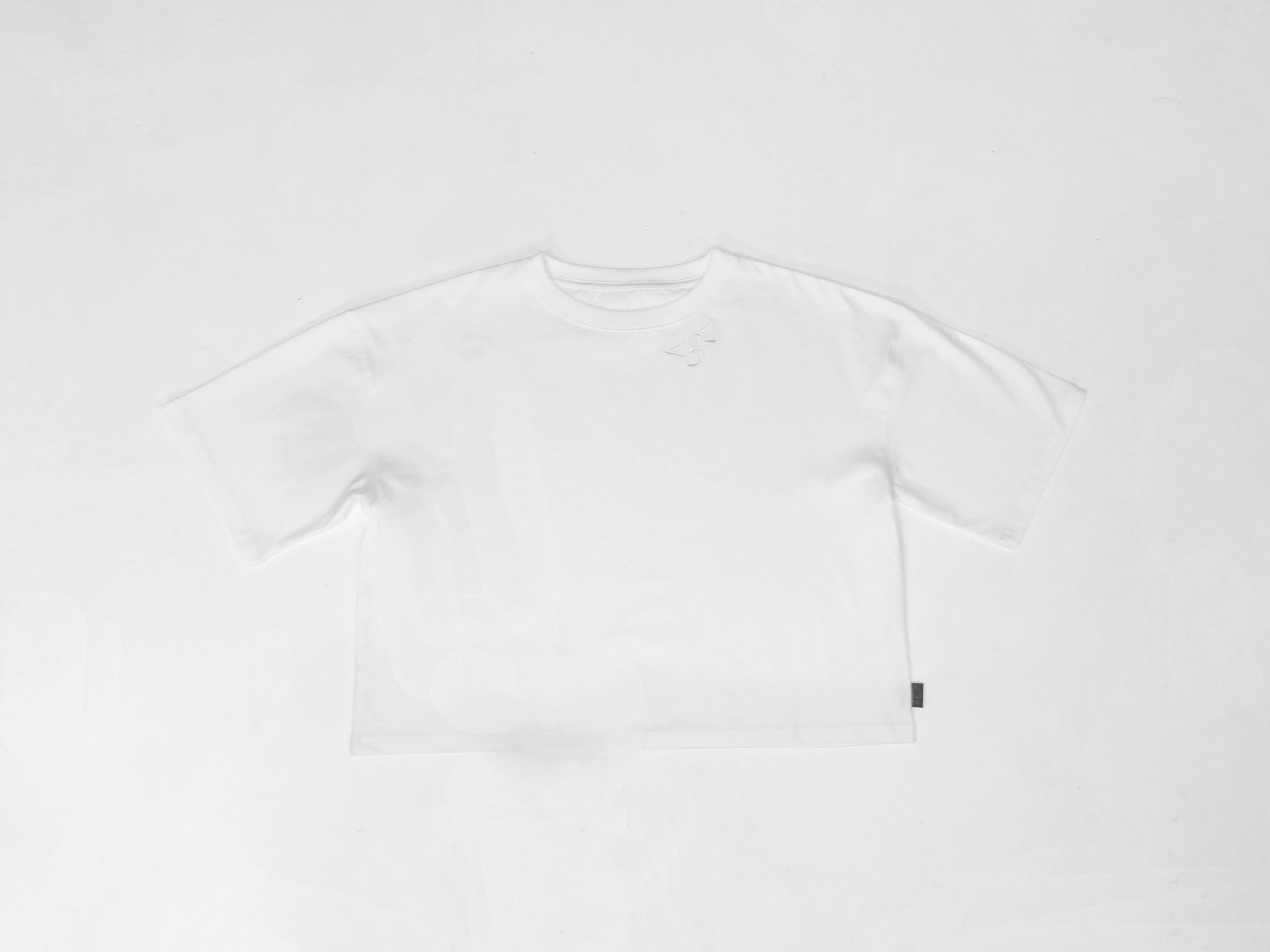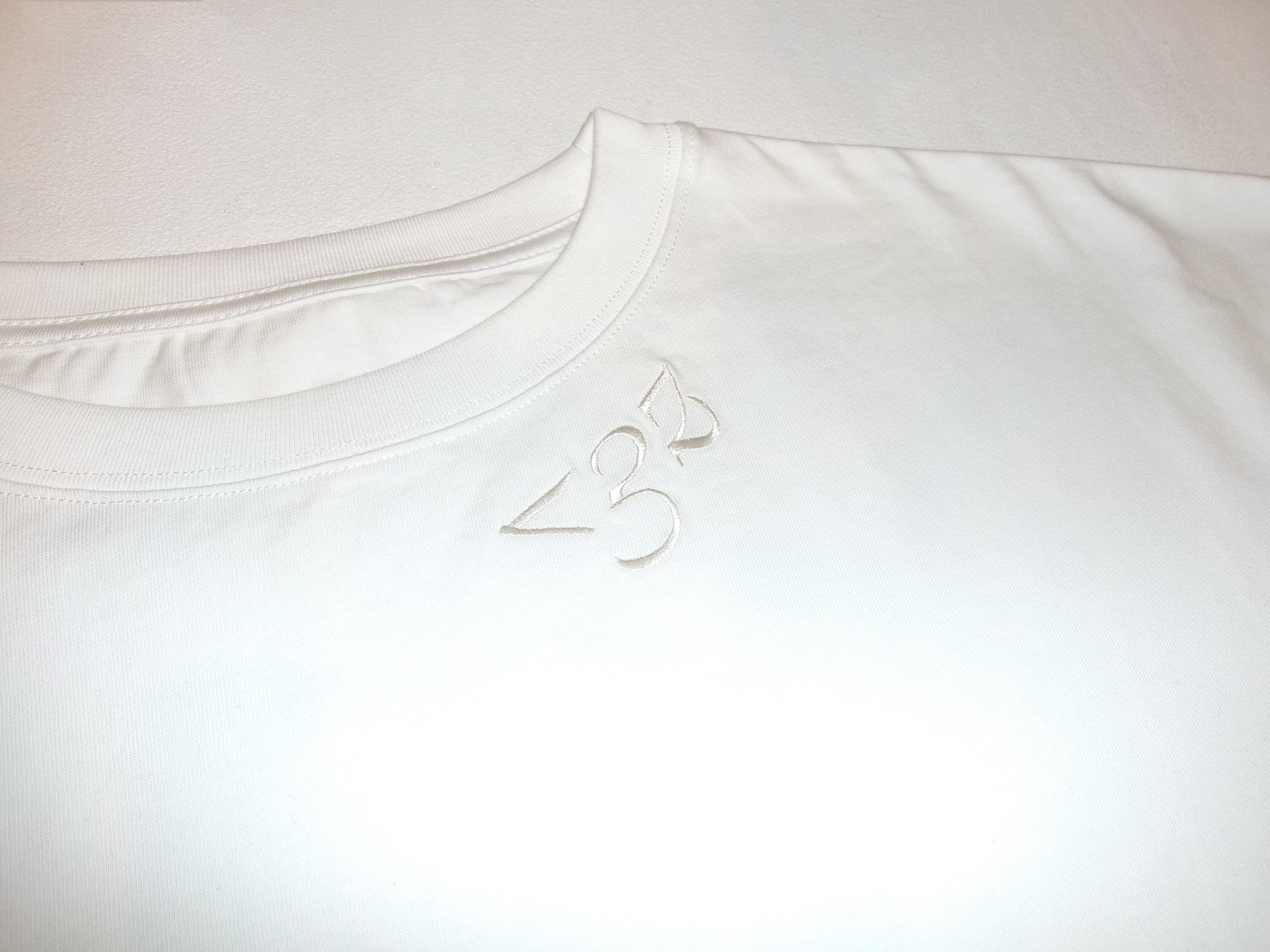 首元に<3zのミニロゴと、背面にスミレをイメージした花の小池俊司による手書きデザインを刺繍で施したTシャツ。