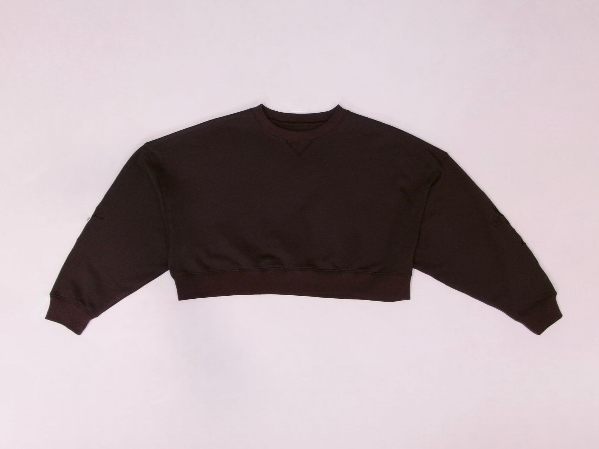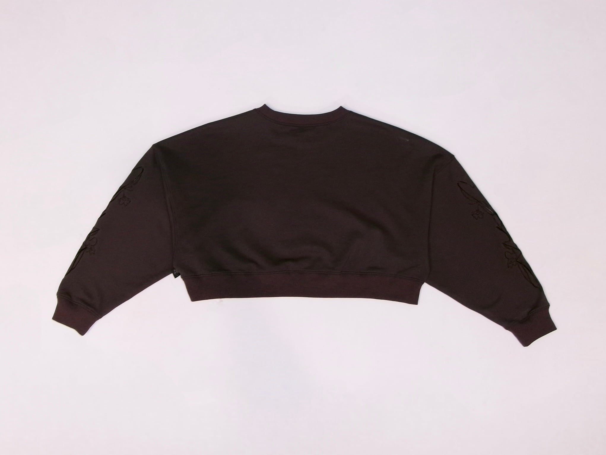 両腕にスミレをイメージした花の小池俊司による手書きデザインを刺繍で施したクルーネックスウェット。