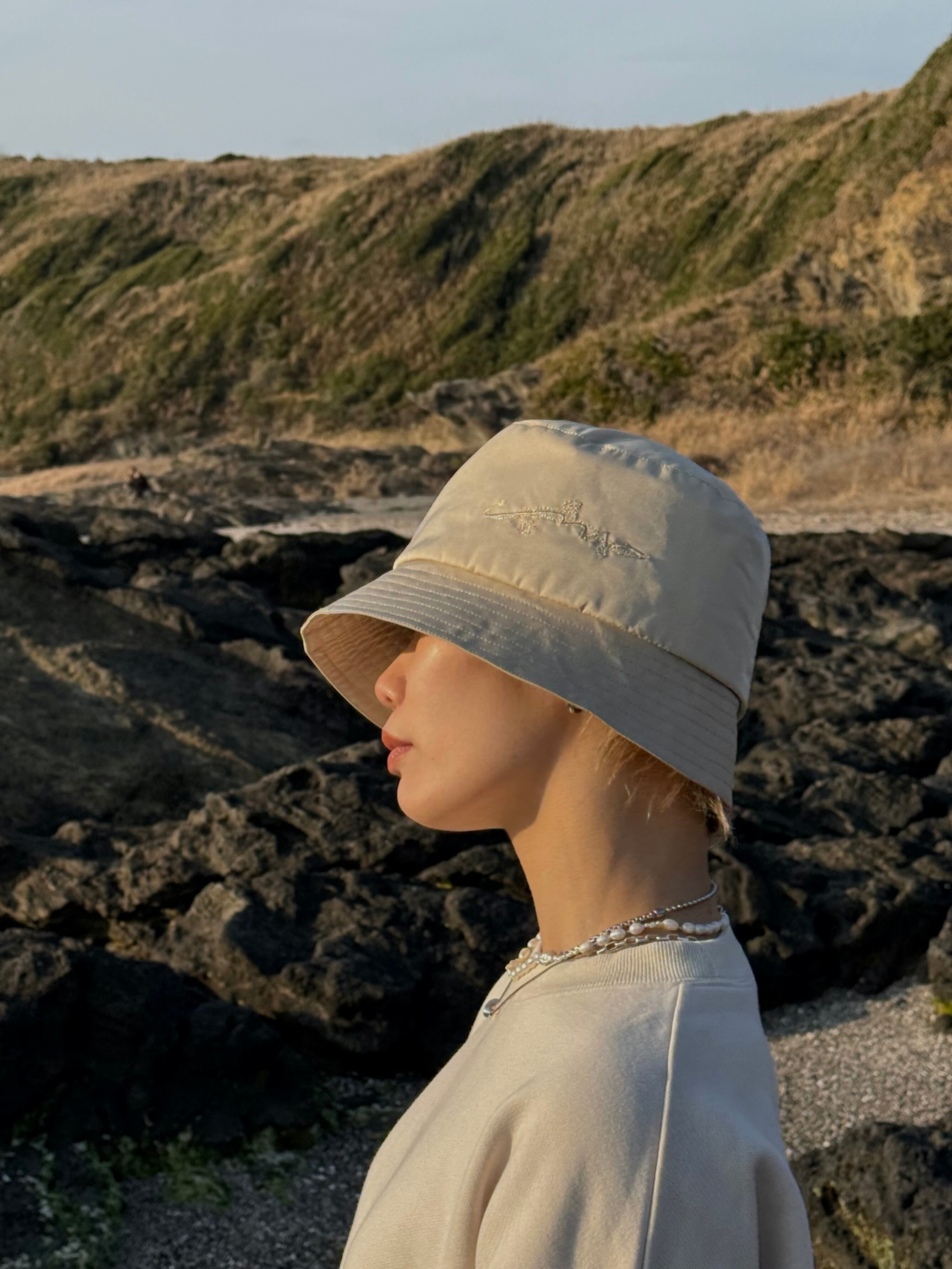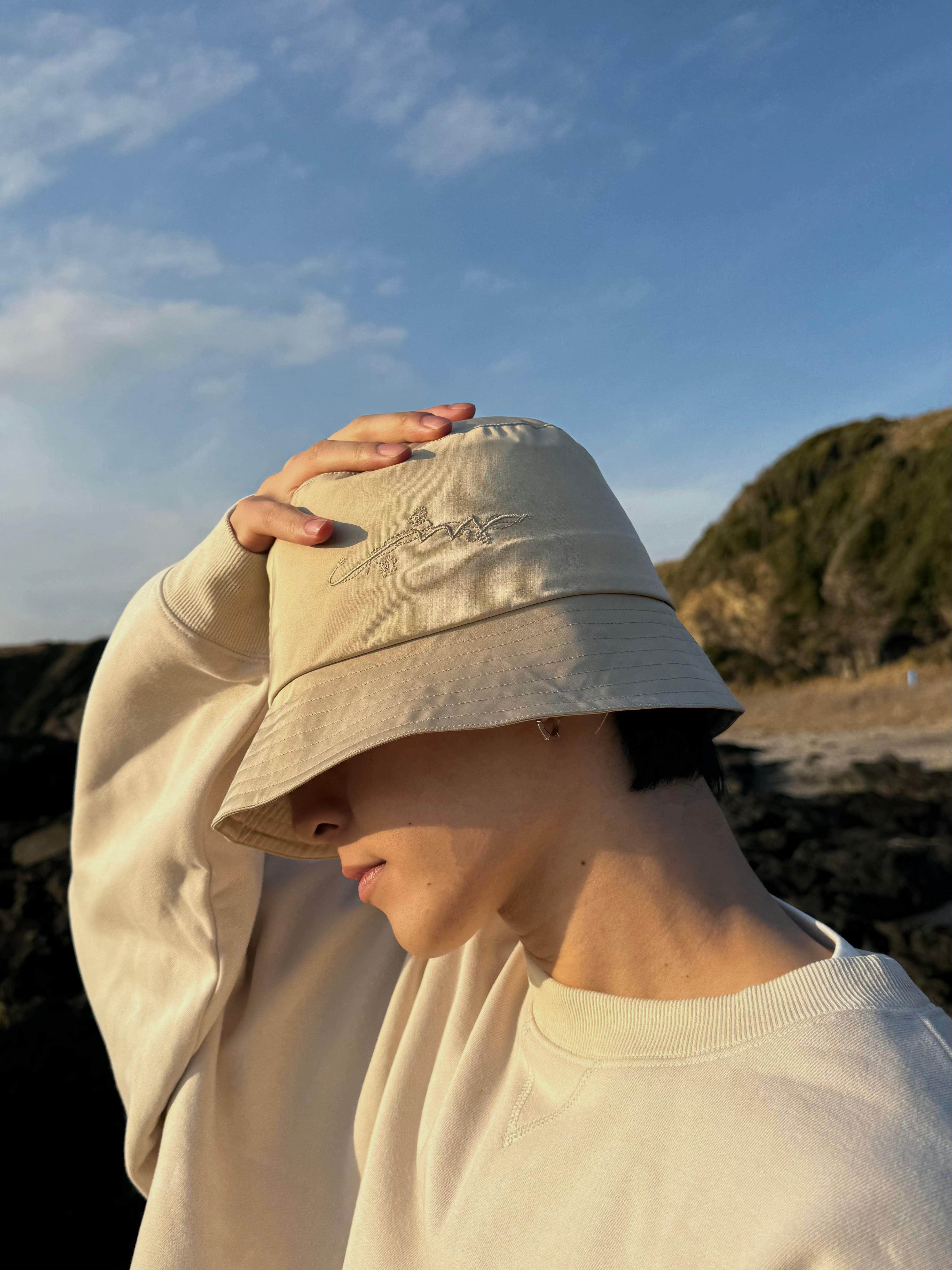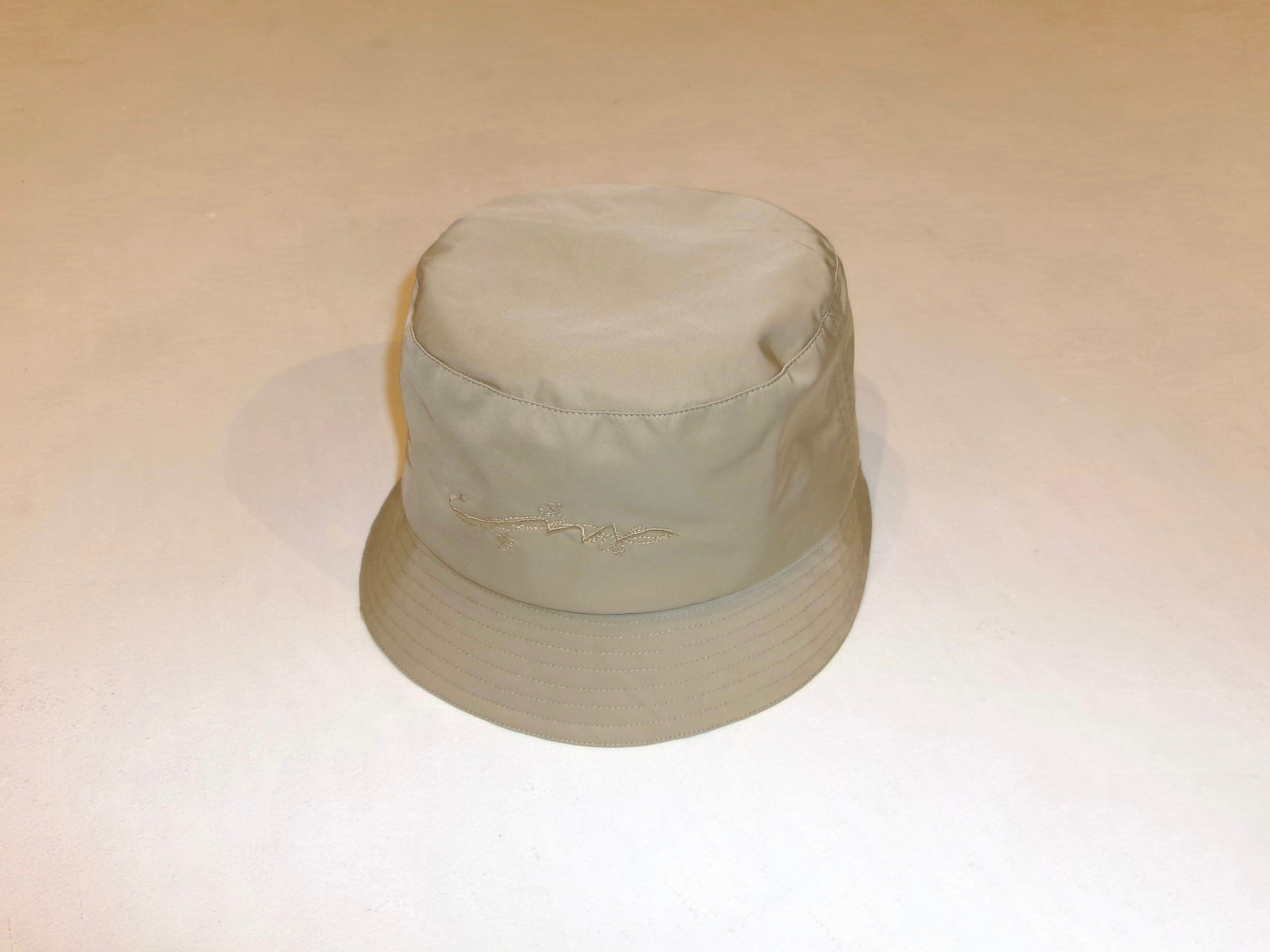 スミレをイメージした花の小池俊司による手書きデザインを刺繍で施したナイロン製のバケットハット。
